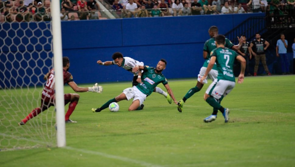Nos minutos finais do primeiro tempo, o Manaus conseguiu fazer uma pressão e dessa forma, chegou ao gol. Aos 45 minutos, o Gavião do Norte conseguiu boa troca de passes na área. Mateus Oliveira deu uma bicicleta, a bola foi pra direção errada e ficou com Janeudo, que de cabeça passou pra Rossini. O atacante ficou com a bola, chutou forte, a bola bateu no travessão e entrou.
