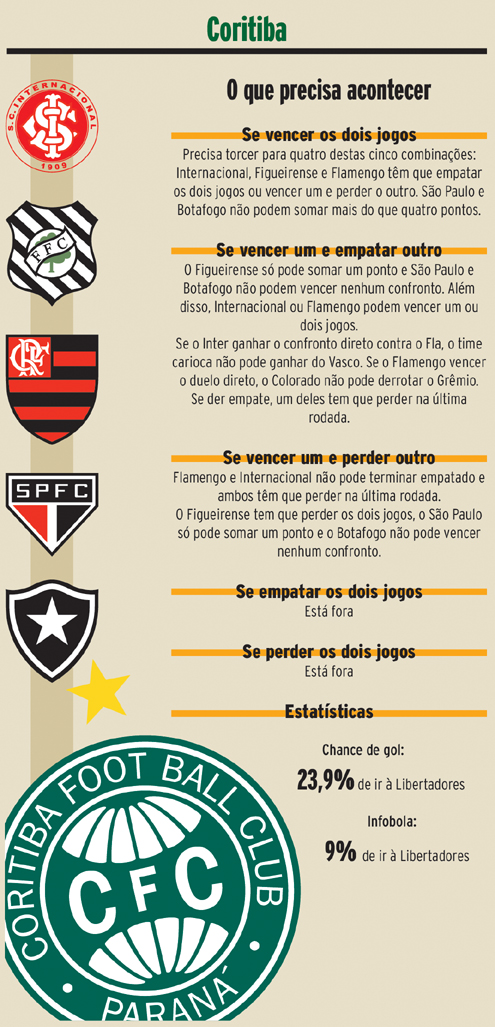 A combinação mais complicada é a do Coritiba, uma vez que briga com outros cinco times pelas duas vagas que restam na Libertadores 2012. O Alviverde não pensa em outro resultado que não seja a vitória diante do Avaí e do Atlético. Ainda assim, precisa torcer para que Internacional x Flamengo não termine empatado no próximo domingo, e que o vencedor perca na última rodada ou que ambos empatem seus dois próximos compromissos. Mesma situação em relação ao Figueirense, que precisaria perder uma das partidas ou empatar as duas. No caso de São Paulo e Botafogo, dois empates ou uma derrota de cada um já seria o suficiente para facilitar o caminho alviverde (confira quadro).