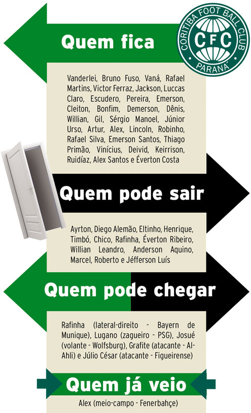 Faltando apenas três jogos para terminar a temporada, o foco do Coritiba já começa a ser 2013. O próprio técnico Marquinhos Santos admite que utilizará as partidas contra Vasco, Cruzeiro e Figueirense para avaliar algumas peças do elenco, de olho no ano que vem. Entretanto, a mudança do grupo atual para a próxima temporada tende a ser mínima.No momento, o clube conta com 45 jogadores no elenco – já incluindo o meio-campo Alex. Destes, poucos devem ir embora. O único certo é o lateral-direito Ayrton, que já assinou um pré-contrato com o Palmeiras e nem tem sido utilizado. Da equipe considerada titular, apenas os meio-campistas Rafinha e Éverton Ribeiro poderiam ser negociados com o futebol chinês e o Cruzeiro, respectivamente. A tendência é de que cerca de 70% do grupo seja mantido.