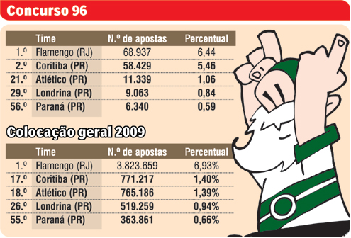Das 15 mil apostas que o clube vinha obtendo nas duas últimas apurações, os resultados anunciados dia 31 de dezembro apresentam um salto para mais de 58 mil -número maior até que o mais expressivo público do Coritiba no Brasileirão (média 33 mil pagantes). No concurso 96, apenas o Flamengo teve mais apostadores, cerca de 10 mil acima do Coxa.