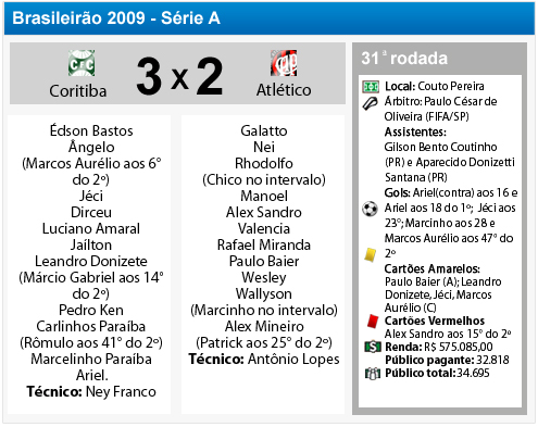 Com a vitória, o Coritiba chegou aos 37 pontos se mantendo na 15ª colocação e na próxima rodada enfrenta o Sport, em Recife. Já o Atlético está com 39 pontos e na próxima rodada encara o Santos, na Arena da Baixada.