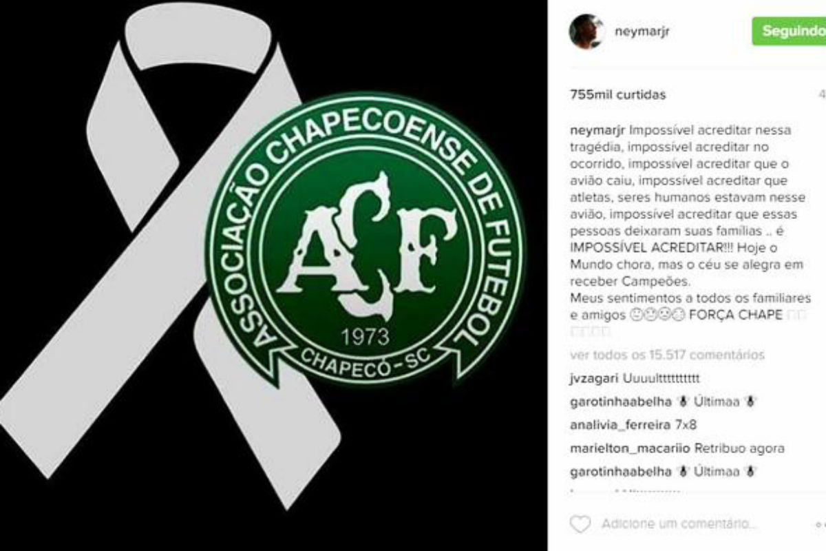 Neymar Jr., em seu perfil no Instagram: “Impossível acreditar nessa tragédia, impossível acreditar no ocorrido […] Hoje o mundo chora, mas o céu se alegra em receber campeões. Meus sentimentos a todos os familiares e amigos. Força Chape”