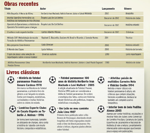 Nos últimos três anos, pelo menos sete livros sobre o assunto foram lançados com paranaenses em destaque. Outros dois têm previsão de lançamento no decorrer de 2012, ambos em Ponta Grossa. Os números locais não chegam a ser expressivos quando comparados a outros estados brasileiros – só o ex-goleiro palmeirense Marcos tem três biografias a serem publicadas esse ano -, mas representam quantia considerável para uma região que até hoje editou estimadas 40 obras sobre o assunto em toda história.