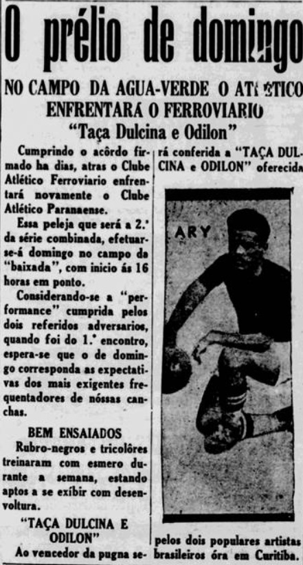 O destaque no jornal O Dia era o amistoso entre Athletico e Ferroviário – o clássico Cap-Caf, que valia a “Taça Dulcina e Odilon”. Mas o que é isso? Foi na verdade um agrado aos atores Dulcina de Moraes e Odilon Azevedo, que estavam em Curitiba para uma série de apresentações teatrais.