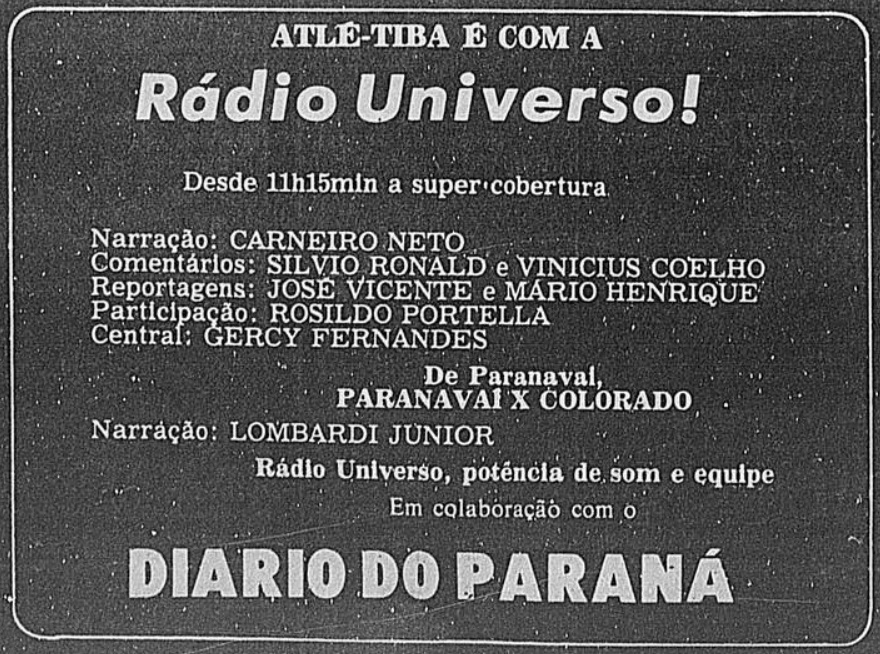 Era dia de Atletiba, com expectativa de casa cheia naquele 6 de abril de 1975. E Carneiro Neto iria dar o recado na rádio Universo. E olha o timaço que iria trabalhar!