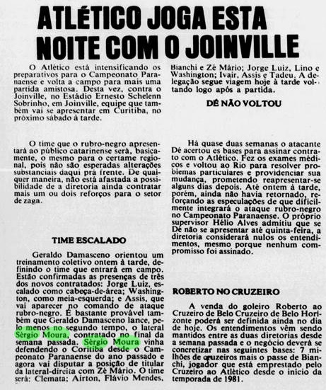 Em cinco temporadas, Sérgio Moura foi contemporâneo de Roberto Costa, Déti, Jorge Luís, Lino, Ivair, Nivaldo, Joel e, claro, Assis e Washington. Foi titular tanto no título paranaense de 1982 – contado no podcast De Letra dessa semana – quanto no bicampeonato do ano seguinte e também na conquista do Estadual em 1985, que marcou o último jogo no velho Joaquim Américo até a reforma de 1994 – aquela goleada sobre o Londrina com invasão de campo e tudo. Após encerrar a carreira, foi técnico da base rubro-negra, tendo subido uns certos Adriano Gabiru e Warley para o time principal.