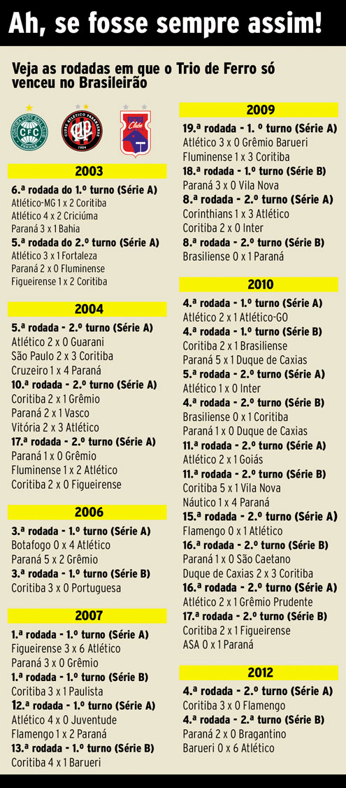 As vitórias do Atlético sobre o Grêmio Barueri, por 6 x 0; do Paraná sobre o Bragantino, por 2 x 0, e do Coritiba em cima do Flamengo por 3 x 0, no final de semana, permitiram, depois de 22 meses, que o Trio de Ferro voltasse a dar alegrias para suas respectivas torcidas em uma rodada única de Campeonato Brasileiro. Desde novembro de 2010, Furacão, Coxa e Tricolor não venciam seus adversários no mesmo dia ou com uma diferença de 48 horas entre um jogo e outro. Além disso, o Cianorte engrossou a lista dos paranaenses bem sucedidos com a vitória sobre o Juventude ontem, por 3 x 0, garantindo participação nas quartas-de-final da Série D do Brasileirão.
