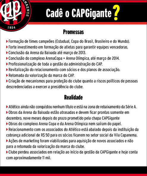 Parece ter se esgotado a paciência do torcedor do Atlético com a atual gestão do clube, liderada pelo presidente Mário Celso Petraglia. Um grupo de rubro-negros, alheios a qualquer facção atleticana, organiza uma manifestação para antes do jogo contra o Corinthians, na Vila Capanema, contra as promessas não cumpridas pela chapa CAPGigante. Até ontem, via redes sociais, 800 atleticanos tinham confirmado participação no protesto que acontece domingo, ao meio-dia, em frente à Arena da Baixada.