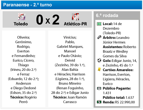 O Atlético deu um importante passo para tentar conquistar o returno e, deste jeito, evitar uma final. O rubro-nergo foi até Toledo e venceu os donos da casa pelo placar de 2 a 0, gols de Edgar Junio e Zezinho. A vitória leva o Atlético para a terceira colocação do campeonato com 13 pontos, atrás dos líderes Londrina e Coritiba, que possuem 15.