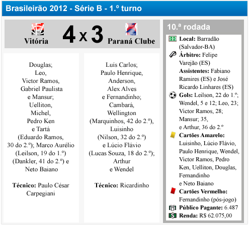 Tinha mais jogo pela frente e Mansur fez o quarto do Vitória, aos 34 minutos. Porém, dois minutos depois, o atacante Arthur colocou o Paraná na partida novamente: 4 a 3. Mas, já não havia mais tempo para o empate. Final de jogo em Salvador e muita reclamação dos atletas paranistas em campo.