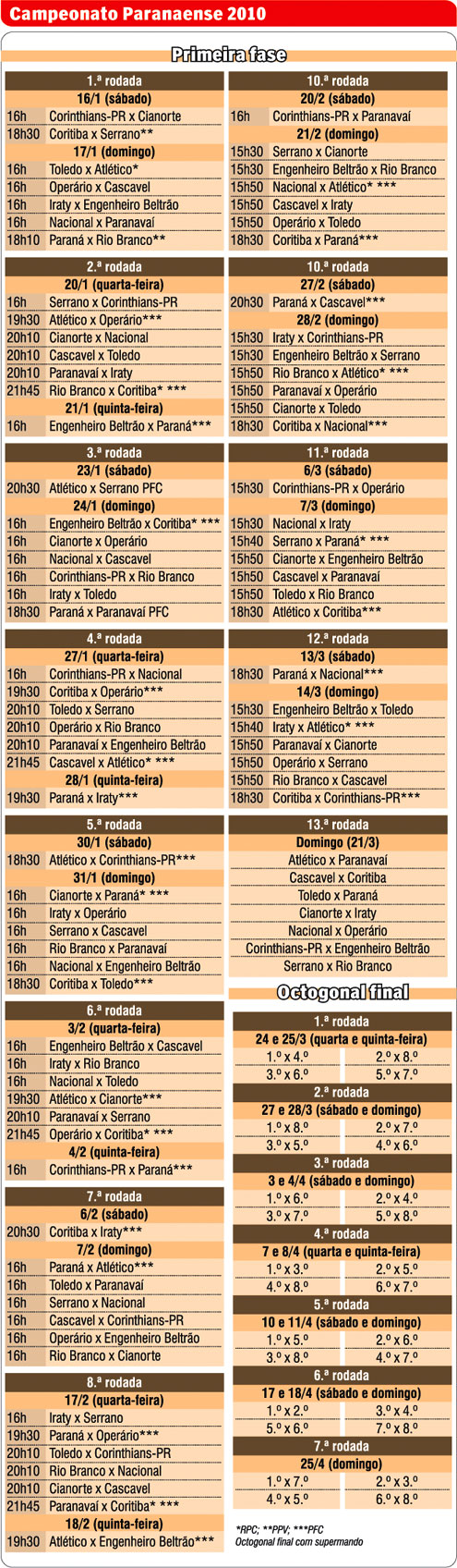Vem aí, o Campeonato Paranaense 2010. Ontem pela manhã os clubes participaram do arbitral e definiram a tabela da competição. A bola vai rolar nos gramados paranaenses a partir do dia 16 de janeiro e o campeão estadual será conhecido no dia 29 de abril.
