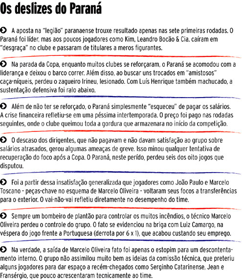 O Tricolor mantém a segunda folha mais barata da Segundona (só perde para o ASA, seu adversário de sábado passado). Mas, apesar do orçamento modesto – cerca de R$ 350 mil por mês, segundo os dirigentes – fica a sensação de que o grande problema do Paraná foi não ter honrado seus compromissos.