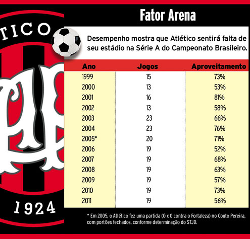 O retorno do Atlético à Primeira Divisão tem um aspecto diferente em relação às participações do clube em edições anteriores da Série A do Campeonato Brasileiro: o fator Arena. Desde a inauguração do estádio, em junho de 1999, a Baixada sempre foi uma forte aliada do Furacão nas disputas da elite nacional até 2011. Neste período, o estádio fez do Rubro-Negro um dos clubes que melhor soube aproveitar o mando de campo.