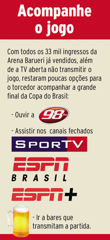 O torcedor que quiser acompanhar a final da Copa do Brasil entre Coritiba e Palmeiras, na Arena Barueri, terá que ouvir no rádio ou assistir a partida nos canais de TV fechados. Isto porque os 4 mil ingressos destinados aos coxas-brancas foram vendidos ontem, em menos de uma hora. Os bilhetes para a torcida palmeirense já haviam se esgotado no sábado passado.