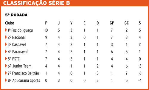 O time aproveitou o fato de o Cascavel ter tropeçado ontem ao empatar em 0x0 com o Francisco Beltrão, no Anilado, e ter parado nos sete pontos. Porém, o Foz é o único clube que até o momento não folgou em nenhuma rodada (por conta da desistência de Colorado e São José, dois times folgam por rodada) e tem um jogo a mais que os principais concorrentes. Vice-líder, com nove pontos, o Nacional não jogou ontem, mas foi o mais favorecido com os resultados e pode assumir a liderança no final de semana.