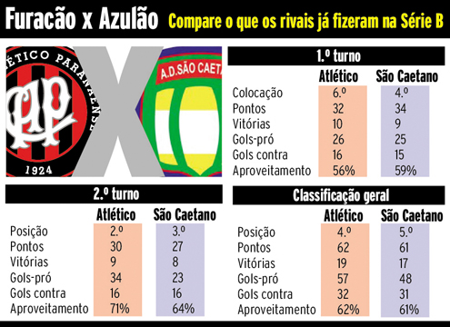 No próximo sábado, no estádio Anacleto Campanella, Atlético e São Caetano fazem um duelo com cara de decisão. Estará em jogo uma vaga na Série A de 2013. O Furacão entra em vantagem no confronto, tanto na classificação – ocupa o G4, enquanto o Azulão é o 5.º colocado – quanto no atual momento da Segundona. O Rubro-Negro conseguiu se estabilizar e iniciar uma ascensão a partir do segundo turno. Já o São Caetano, que chegou a ser terceiro colocado, não conseguiu manter seu desempenho inicial e deixou o grupo de acesso.
