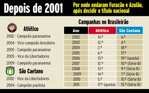 No próximo sábado, Atlético e São Caetano não fazem apenas um duelo pela 4.ª colocação na classificação da Série B. O jogo pode representar a chave para um dos dois volte a ser grande no cenário nacional. Depois de serem protagonistas na final do Brasileirão de 2001, com o Furacão levando a melhor e ficando com o título, os clubes foram caindo no ostracismo e agora tentam se reerguer.