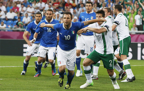 A Itália sofreu, mas garantiu vitória por 2 a 0 sobre a Irlanda, garantindo sua classificação no grupo C da Eurocopa, nesta segunda-feira, em Poznan, na Polônia, em jogo válido pela última rodada da chave.