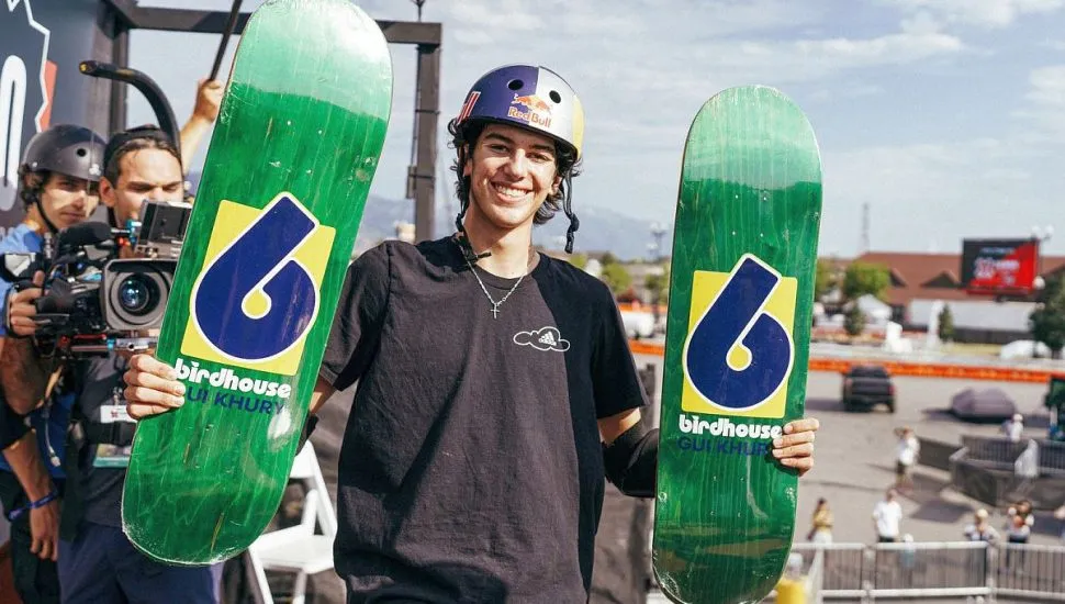 O skatista curitibano Gui Khury viveu um dos momentos mais importantes de sua carreira na última quinta-feira (26). Com apenas 16 anos, após duas medalhas de ouro no X-Games de Osaka, conquistadas no último final de semana, o skatista brasileiro recebeu das mãos de Tony Hawk o seu primeiro pro model pela Birdhouse, marca fundada pelo lendário skatista norte-americano.