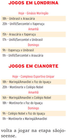 Londrina e Cianorte vão receber neste final de semana o 3.º Grand Prix do Campeonato Estadual Adulto de Vôlei, realizado pela Federação Paranaense de Voleibol com jogos dos grupos feminino. Os 4 melhores times de cada naipe vão disputar o GP final nos dias 14, 15 e 16 de setembro em município a ser definido conforme a classificação dos clubes. Nesta etapa em Londrina, os jogos serão no Ginásio Moringão e as equipes que vão disputar o título são Unifil/Londrina/Sercomtel, Unibrasil, Araucária/Universidade Positivo e Itaperuçu/Cia do Vôlei. As duas etapas anteriores do grupo feminino aconteceram em Cascavel e Araucária. Quem lidera o grupo é a equipe do Ponta Grossa/Círculo Militar/Dom Bosco, com 36 pontos, que segue invicta na competição e folga nesta rodada. O time da casa está em terceiro lugar, com 13 pontos acumulados. A quarta etapa do feminino será em São José dos Pinhais de 20 a 22 de julho.