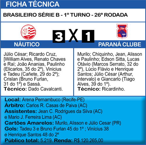 Por outro lado, o Náutico chegou a carimbar a trave da meta do goleiro Murilo. Aos 38 minutos, o ex-paranista Vinicius ainda marcou o terceiro. No minuto final, o meia Henrique diminuiu para o Paraná. Fim de jogo: Náutico 3×1 Paraná.