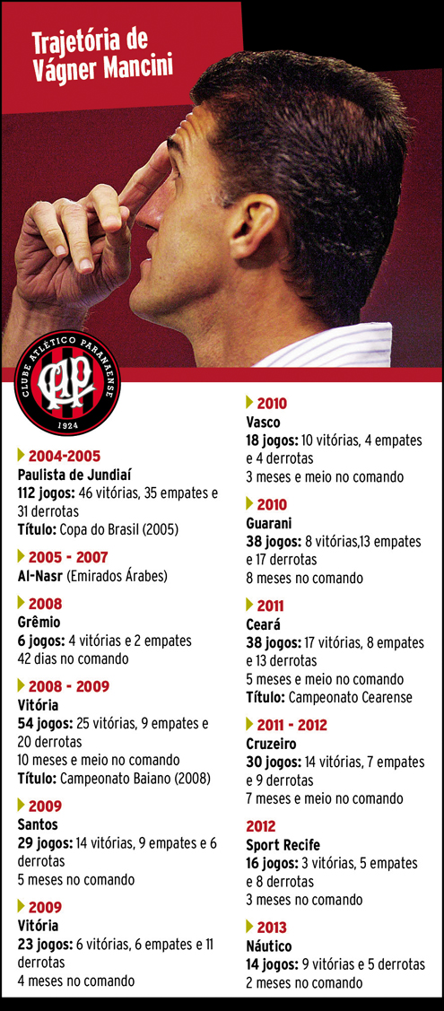 O Atlético anunciou ontem cedo que Vágner Mancini será o técnico para a sequência da temporada. Ele chega a Curitiba amanhã e terá pela frente dois grandes desafios. O primeiro é recuperar o Furacão no Campeonato Brasileiro – o time é o 19.º colocado. Já o segundo, é acabar com o retrospecto, tanto dele quanto do clube, de não desenvolver trabalhos a longo prazo.