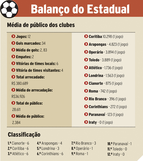 Em duas rodadas do Campeonato Paranaense 2012, 28.611 torcedores foram aos estádios ver seus times. As redes balançaram 34 vezes e três equipes seguem na ponta da tabela (Coritiba, Atlético e Cianorte, com 6 pontos). Em 12 confrontos, a média de gols do Estadual é de 2,83 por partida.