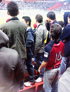 Com um grupo em pé, próximo ao gramado, os sócios das primeiras fileiras precisam subir às cadeiras para assistir ao jogo. Alguns estão incomodados em ter de ficar em pé e pedem uma medida da diretoria.