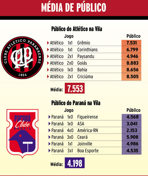 O estádio é do Paraná Clube, mas a torcida do Atlético está fazendo da Vila Capanema o seu caldeirão até agora no Campeonato Brasileiro e pela Copa do Brasil. Em números, a média de público do Rubro-Negro no Durival Britto é quase duas vezes maior que a do Paraná Clube. Neste final de semana, a briga de quem vai colocar mais torcida no estádio paranista será acirrada, já que os duelos entre o Tricolor e o Sport, hoje, e Atlético e Botafogo, amanhã, devem receber grandes públicos.