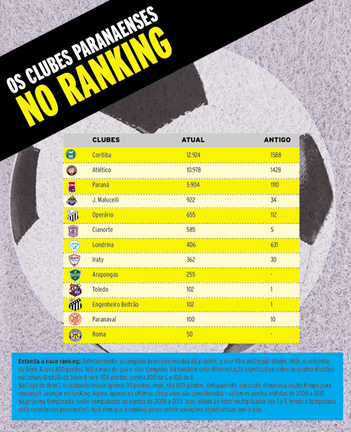 As novas regras também afetam os clubes paranaenses. Coritiba e Atlético, mesmo tendo frequentado a Série B pelo menos uma vez nesses últimos anos (o Coxa, em 2010, e o Furacão, em 2012), conseguiram melhorar suas colocações. O Coritiba subirá pelo menos duas posições, enquanto o Atlético avançará seis degraus. Isso, é claro, considerando suas posições atuais na tabela de classificação das Séries A e B. Já o Paraná, hoje em 11.º lugar da Segundona, paga o preço por estar há cinco anos seguidos longe da elite. O clube tende a cair quatro posições, ocupando o 27.º lugar.