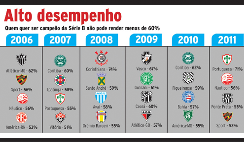 Ano passado, a Portuguesa conquistou 71% dos pontos e levou a Série B com uma larga vantagem sobre os rivais. O Náutico, segundo colocado teve apenas 56% de aproveitamento. Embora os índices de desempenho para ser campeão estejam sempre acima de 60%, para simplesmente voltar à elite do Brasileirão o caminho é menos exigente. Nos últimos anos, a média dos clubes que conseguiram o acesso ficou em 56,3%. Mas isso varia de acordo com a campanha do primeiro colocado. Em 2007, quando o Coxa foi campeão com o menor aproveitamento da Série B na era dos pontos corridos, os índices dos outros três clubes classificados também foram menores, com dois deles conseguindo subir com 55% de desempenho.