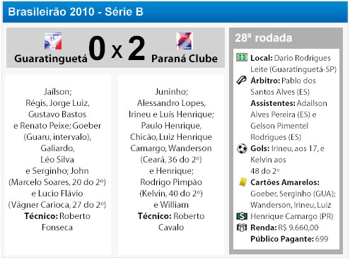O Paraná seguiu apertando e estava mais próximo de fazer o segundo gol do que tomar um tento. E o segundo gol chegou através de outro estreante. O atacante Kelvin, oriundo das categorias de base do clube, chutou cruzado, aos 47min, para fechar o caixão do Guaratinguetá. Final de jogo: Guaratinguetá 0x2 Paraná Clube.