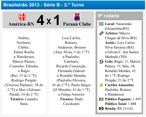 A etapa final foi de muita movimentação dos dois times. O Paraná pressionava e o América-RN levava muito perigo nos contra-ataques. Aos 21 minutos, em uma falha do atacante Felipe Amorim, o Mecão aproveitou, puxou o contra golpe e Rodrigo Pimpão marcou o quarto do time da casa.