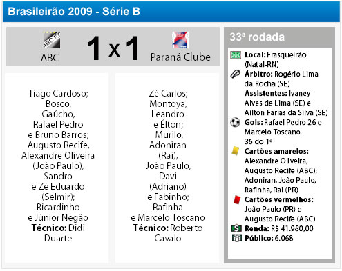 O Paraná Clube empatou em 1 a 1 com o ABC-RN na noite deste sábado (31), no estádio Frasqueirão, em Natal. Rafael Pedro marcou para o time potiguar e Marcelo Toscano deixou tudo igual para o Tricolor. O resultado deixa o Paraná com 46 pontos na nona posição e o ABC fica com 32 pontos, na lanterna da Série B.