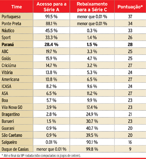 Mesmo se mantendo no G4, o Tricolor já trabalha sob pressão e os matemáticos já não conferem ao representante paranaense o favoritismo de outrora. O Paraná chegou a ter, segundo o site chancedegol.com.br, mais de 40% de chances de acesso à primeira divisão.