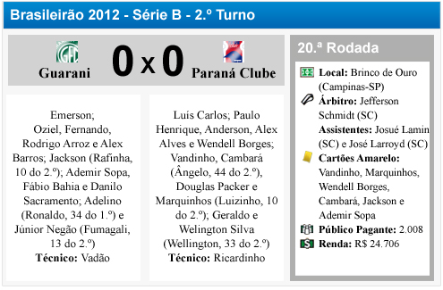 O Paraná Clube largou para o segundo turno da Série B com um empate sem gols, frente ao Guarani. Em um jogo equilibrado, ninguém fez a festa na noite desta terça-feira, em Campinas.
