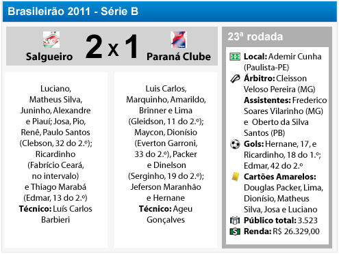 O Paraná Clube foi derrotado de virada pelo Salgueiro, por 2 a 1, nesta terça-feira, na 23ª rodada da Série B. Hernane abriu o placar para o Tricolor no primeiro tempo. Ainda na etapa inicial, Ricardinho empatou o jogo. Aos 42min do segundo tempo, Edmar colocou números finais ao duelo.