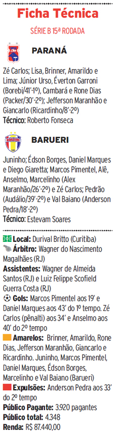 Paraná era só pressão e aos 14 minutos levou perigo novamente. Borebi recebeu na área, mas bateu prensado facilitando para o goleiro Juninho. Aos 33 minutos, Jefferson Maranhão colocou na frente e foi derrubado dentro da área: pênalti. No lance, Anderson Pedra foi expulso. O goleiro Zé Carlos cobrou com categoria e diminuiu o placar. O Tricolor foi pra cima, mas deu o contra-ataque para o Barueri. Foi assim que o time paulista marcou o terceiro gol. Aos 39 minutos, Anselmo disparou livre, passou por Brinner e chutou no meio das pernas de Zé Carlos, que aceitou. Final: Paraná 1, Barueri 3.