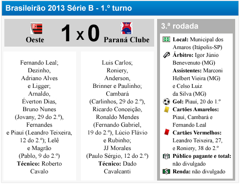 O Paraná Clube não fez uma boa partida diante do Oeste e foi derrotado por 1 a 0, na noite desta sexta-feira (31), em Itápolis. Com o resultado, o Tricolor sai do G4 da Série B do Campeonato Brasileiro, enquanto o time paulista consegue sua primeira vitória na competição.