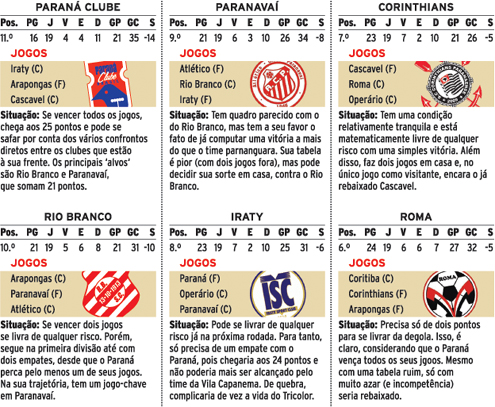 O Paraná Clube, é fato, não depende apenas de suas forças para sobreviver na primeira divisão do futebol paranaense. Com 5 pontos de desvantagem para Rio Branco e Paranavaí, terá que secar concorrentes e buscar um aproveitamento de 100% nas três rodadas que restam.