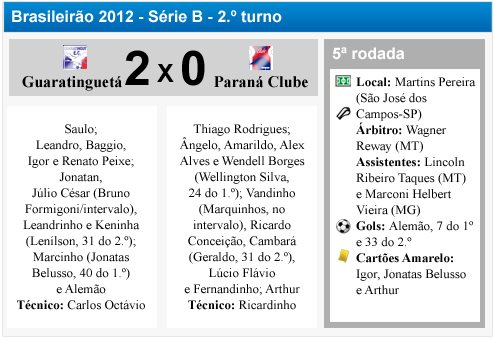 Com uma péssima campanha jogando longe de seus domínios – o Paraná venceu apenas um jogo fora de casa nesta Série B -, o Tricolor começou o jogo sonolento. Com isso, o Guaratinguetá aproveitou para abrir o placar logo aos sete minutos, com o artilheiro Alemão.