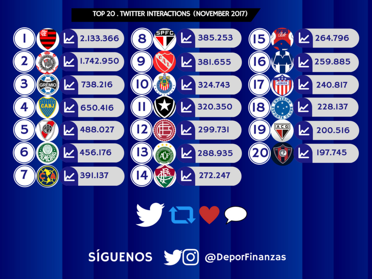 💻SOCIAL-MEDIA | ⚽️¡Los 20 clubes de América con más interacciones en #twitter durante noviembre 2017!