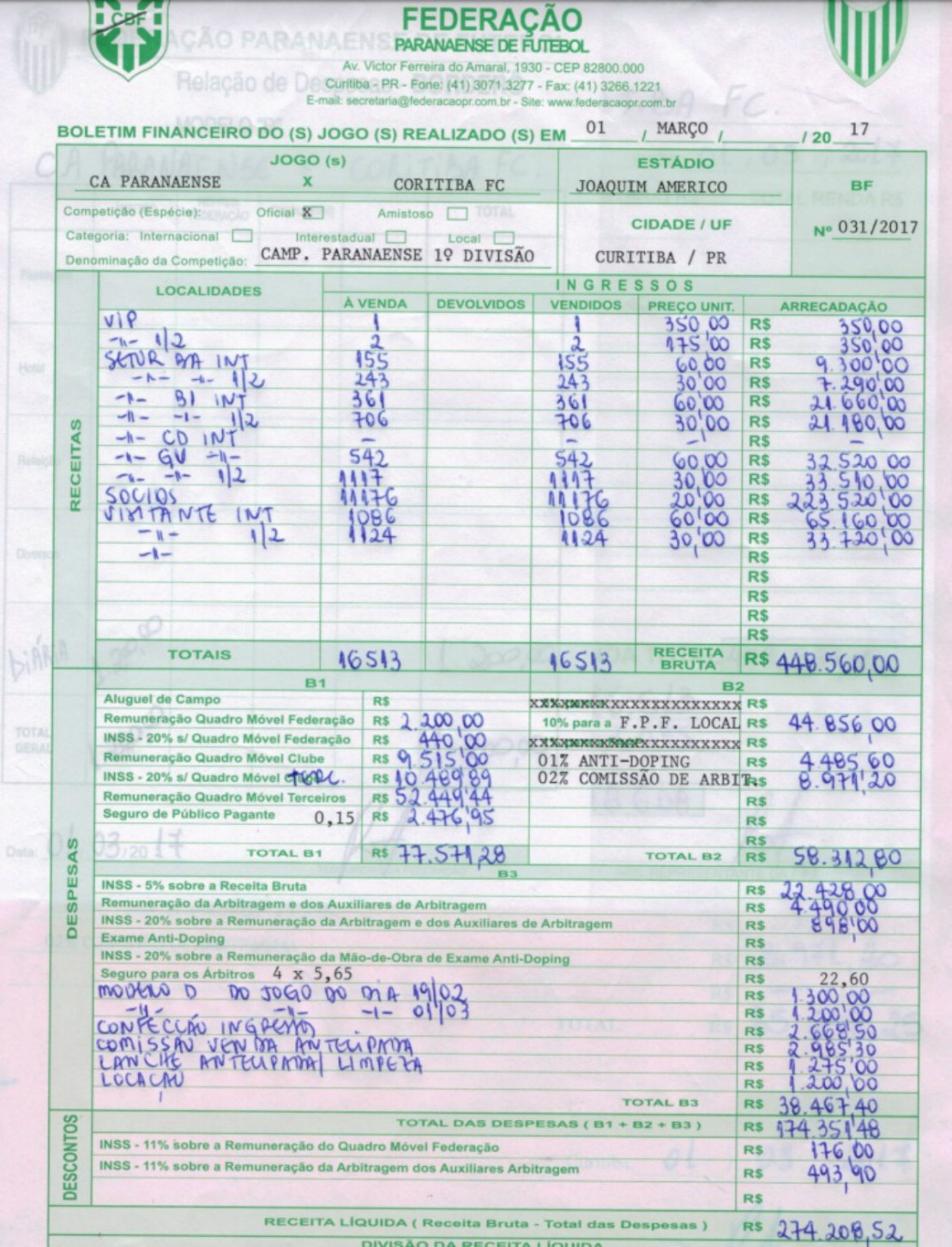 No total, o Furacão arrecadou R$ 510.315,36, enquanto a FPF, sem escalar time e nem entrar em campo já soma R$ 310.438,40. Este valor se deve ao fato de a entidade ter direito a 10% de todas as rendas da competição. Em seguida vem Coritiba, com R$ 170.134,10, e Cascavel, com R$ 169.938,84.