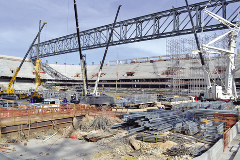 A promessa era que até o final de outubro a estrutura metálica já estivesse concluída e os guindastes fossem retirados. No entanto, em fotos divulgadas pela CAP S/A – sociedade de propósito específico criada para gerir as obras – na quarta-feira passada, ainda é possível ver toda a aparelhagem no local. ‘Nos foi passado que o plantio do gramado começaria na semana que vem. Mas com a interrupção que houve no começo de outubro, talvez demore mais uma semana para que isso seja feito’, explicou o secretário municipal para assuntos da Copa, Reginaldo Cordeiro.
