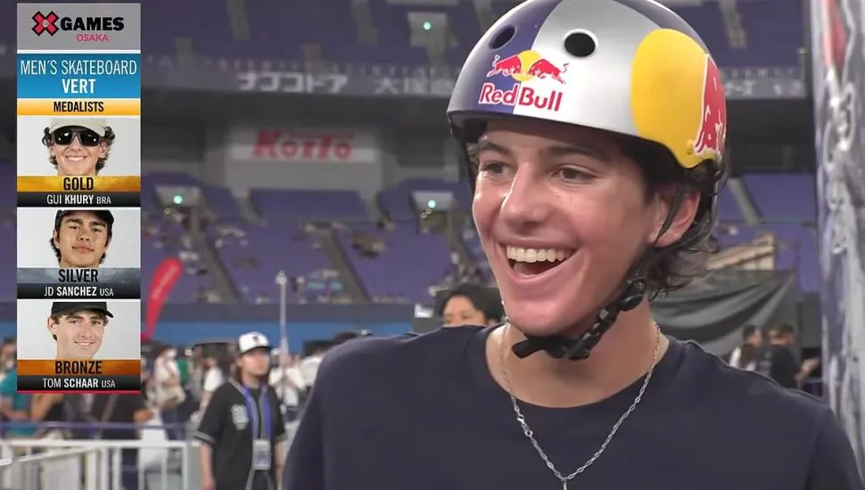 O skatista de Curitiba Gui Khury, de apenas 16 anos, foi o campeão do Vert no X Games na madrugada desta sábado, em Osaka, no Japão. Com a nova medalha de ouro, Gui se torna o adolescente com mais medalhas da história na maior competição de esportes radicais do mundo, com 12 medalhas (seis de ouro, quatro de prata e dois bronzes).