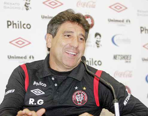 Com foto no banner e com a sigla RG estampada na camisa de passeio do Atlético, o técnico Renato Gaúcho foi apresentado ontem na Arena da Baixada. Otimista e confiante, o novo comandante, que teria sido aprovado pelo elenco numa votação, trouxe ares diferentes para o clube.