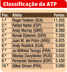 O suíço Roger Federer continua como número um do ranking da ATP, com 2.410 pontos na frente do espanhol Rafael Nadal, como na semana passada.