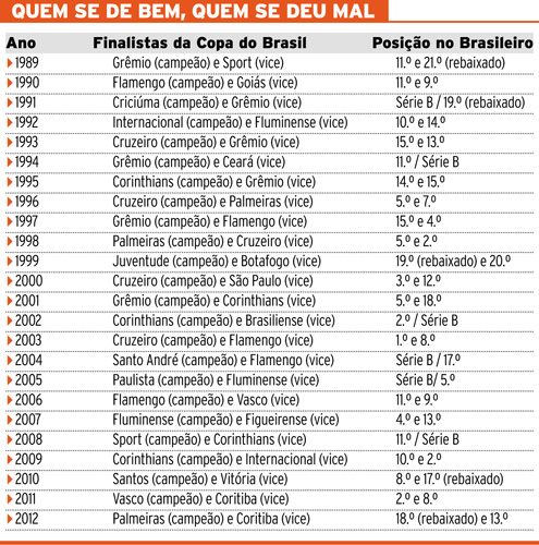 Também já houve campeão da Copa do Brasil rebaixado. Em 1999, o Juventude foi da glória à desgraça. Idem para o Palmeiras, no ano passado.