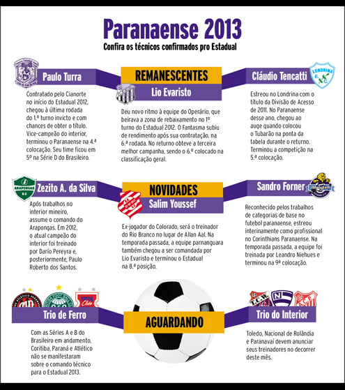 Metade dos 12 clubes que vão participar do Estadual 2013 já confirmaram seus treinadores. Das quatro equipes do Interior que tiveram melhor participação no Campeonato Paranaense deste ano, apenas uma apostou em mudanças no cargo. As outras três optaram pela manutenção dos comandantes para o ano que vem. Foram confirmadas as permanências de Paulo Turra, no Cianorte; Cláudio Tencatti, no Londrina, e Lio Evaristo, no Operário de Ponta Grossa. Entre as caras novas estão Sandro Forner, no J. Malucelli; Salim Youssef, no Rio Branco, e Zezito Araújo da Silva, no Arapongas.