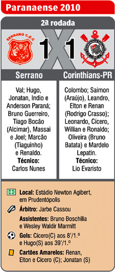 No confronto entre os caçulas do interior e da capital não teve vencedor. Ontem à tarde, o Serrano empatou em casa com o Corinthians Paranaense em 1 a 1 no jogo que abriu a segunda rodada do Campeonato Paranaense.